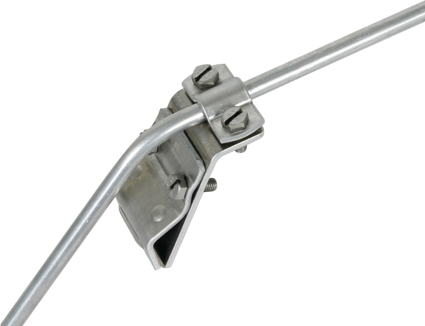 Morsetto per grondaia secondo CEI EN 62561-1, per il collegamento di conduttori tondi al bordo della grondaia. Esecuzione con cavallotto di fissaggio, larghezza costruttiva 40 mm.