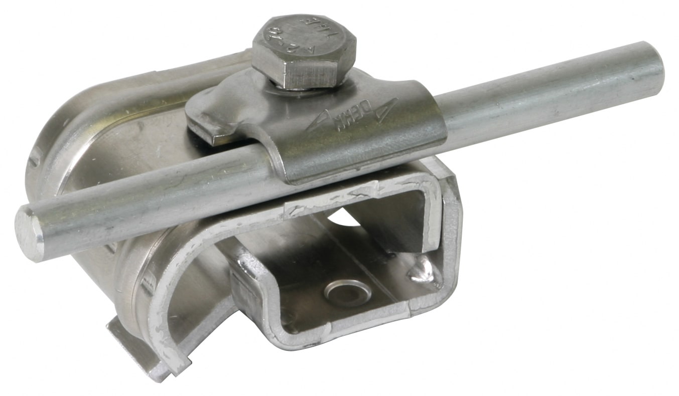Morsetto per grondaia secondo CEI EN 62561-1, per il collegamento di conduttori tondi al bordo della grondaia. Esecuzione con cavallotto di fissaggio, posa del conduttore longitudinale o trasversale.