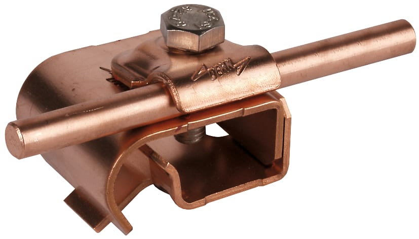 Morsetto per grondaia secondo CEI EN 62561-1, per il collegamento di conduttori tondi al bordo della grondaia. Esecuzione con cavallotto di fissaggio, posa del conduttore longitudinale o trasversale.