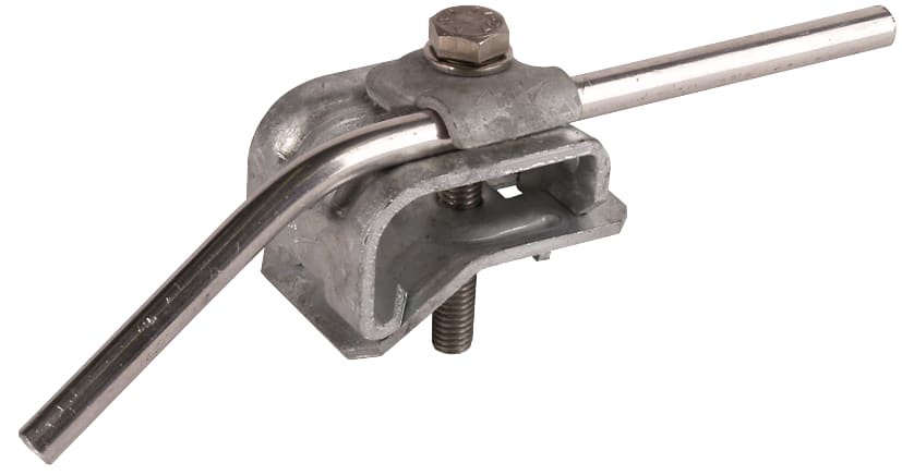 Morsetto per grondaia secondo CEI EN 62561-1 per il collegamento di conduttori tondi con il bordo della grondaia. Esecuzione con vite unica con cavallotto, posa del conduttore longitudinale.