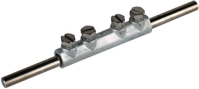 Manicotti di giunzione secondo CEI EN 62561-1 per il collegamento di due conduttori tondi in disposizione longitudinale con 4 viti M6. Esecuzione ZG 8.