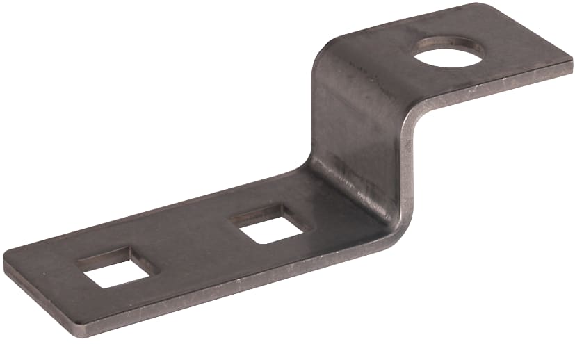 Elemento terminale da avvitare al punto fisso di terra per il collegamento p.es. di una barra equipotenziale oppure per il collegamento di elementi costruttivi (p.es. travi in acciaio o simili) mediante viti. Esecuzione con fori quadrati (11 x 11 mm), per la connessione di conduttori tondi p. es. con connettori KS, per conduttori piatti con viti e dadi M10 o M12.