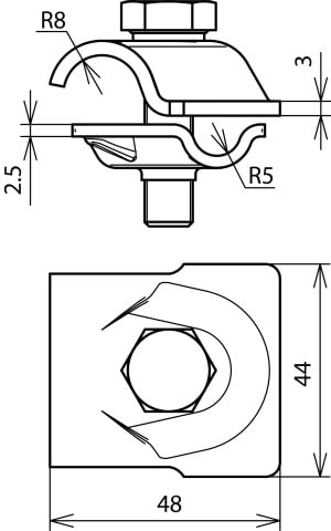 Morsetto MV per collegare un'adduzione a terra o un'asta di captazione (Ø 16 mm) con un conduttore tondo (Ø 8-10 mm). Portata di corrente di fulmine provata fino a 200 kA (10/350 µs) in appoggio alla norma CEI EN 62561-1. Esecuzione componibile con vite esagonale e filetto nella parte inferiore.