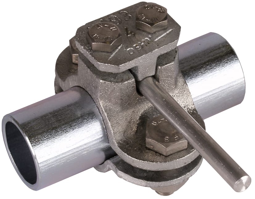 Collare per tubi protezione da fulmini secondo DIN-EN 62561-1 per l'integrazione di tubi nell'equipotenzialita di sicurezza e funzionale secondo DIN VDE 0100-410/540 ed equipotenzialita antifulmine secondo CEI EN 62305-3 (CEI 81-10/3). Esecuzione con viti M10, connessione per Td 4-10 mm o sezione di collegamento max. 70 mm?.
