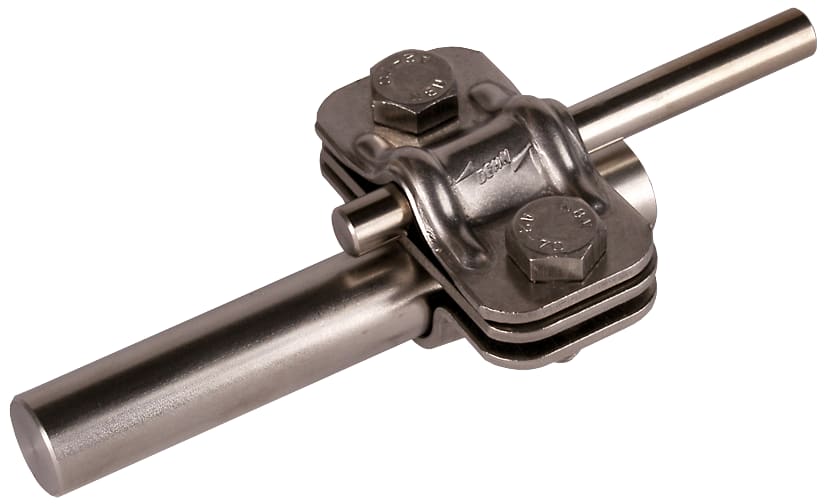 Morsetto di sezionamento UNI secondo CEI EN 62561-1 per il collegamento della calata con l’adduzione a terra. Esecuzione con piastra intermedia per asta dia dduzione a terra Td 16 mm.