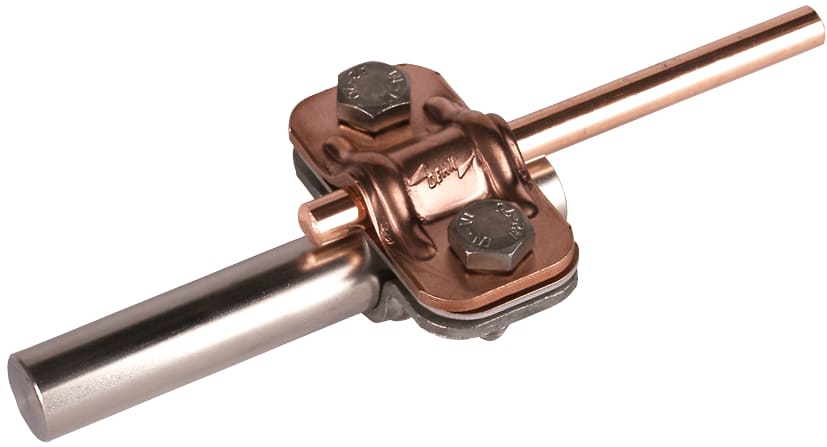 Morsetto di sezionamento UNI secondo CEI EN 62561-1 per il collegamento della calata con l’adduzione a terra. Esecuzione bimetallica per conduttori tondi in Cu e asta di adduzione a terra Fe/tZn oppure INOX (AISI 316).