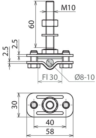Morsetto di collegamento con perno filettato per il collegamento di conduttori Td e Pt ai punti fissi di terra con filetto M10 / 12. Adatto anche per il montaggio sul retro del punto fisso di terra senza astina di collegamento p.es. per conduttore piatto. Esecuzione leggera, con filetto di connessione M10.