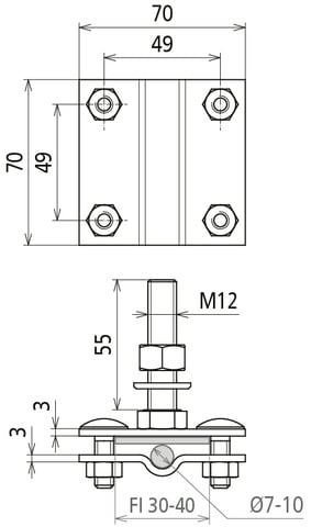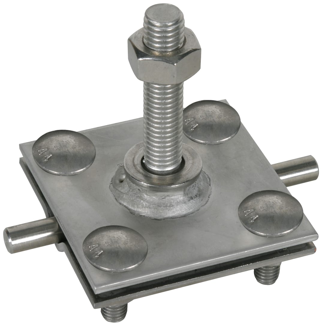 Morsetto di collegamento con perno filettato per il collegamento di conduttori Td e Pt ai punti fissi di terra con filetto M10/12. Adatto anche per il montaggio sul retro del punto fisso di terra senza astina di collegamento p.es. per conduttore piatto. Esecuzione pesante, con filetto di connessione M12.
