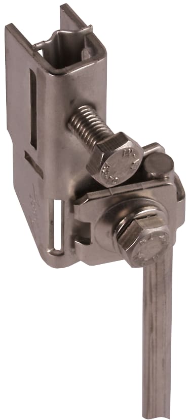 Fascetta di messa a terra per pali d'antenna secondo CEI EN 62561-1 per l'integrazione di tubi nell'equipotenzialità di sicurezza e funzionale secondo CEI 64-8 (DIN VDE 0100-410/540) ed equipotenzialità antifulmine secondo CEI EN 62305-3 (CEI 81-10/3). Esecuzione con nastro separato da combinare con nastro per fascette 25 x 0,3 mm, per la connessione di un conduttore Td D10 mm o 1-2 conduttori Td D6-8 mm o 4-50 mm² (rigido / semirigido).