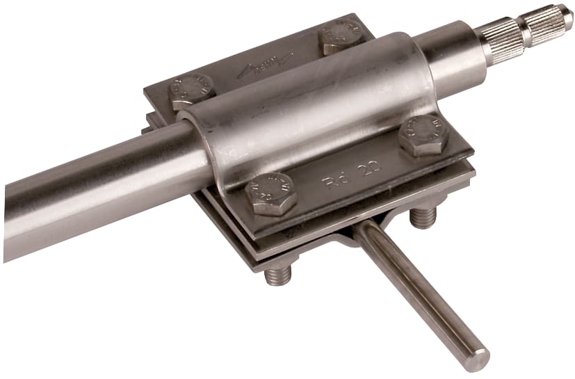 Morsetto di collegamento secondo CEI EN 62561-1 per il collegamento a croce e parallelo di conduttori tondi, piatti oppure cordati a dispersori di profondità. Esecuzione per dispersori di profondità Ø20-30 mm, con quattro viti M8.