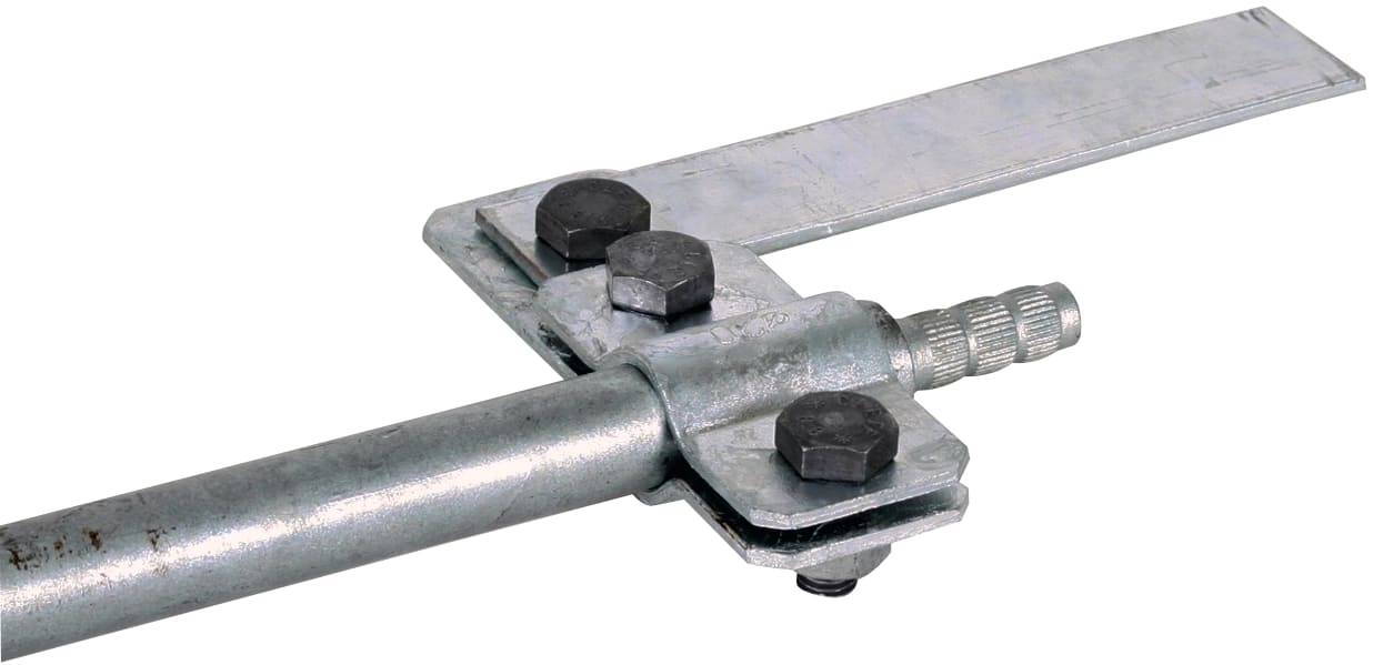 Collare di collegamento secondo CEI EN 62561-1 per la connessione di conduttori piatti su dispersori di profondità. Esecuzione con vite M10 da un lato.