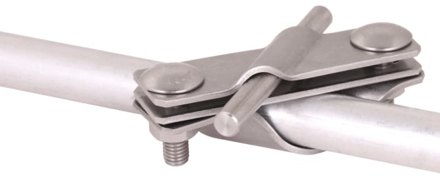 Collare di collegamento secondo CEI EN 62561-1 per la connessione di conduttori tondi, cordati e piatti su dispersori di profondita. Esecuzione obliqua con vite a testa piatta anche per conduttori di terra non tagliati.