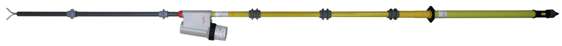 Rivelatore di tensione capacitivo PHE4 secondo DIN VDE 0682-411 (EN/IEC 61243-1) per stabilire la mancanza di tensione su tutti i poli sul posto di lavoro secondo DIN VDE 0105-100 (EN 50110-1) in impianti elettrici. Categoria "S" per quadri elettrici e linee aeree. Utilizzabile anche con precipitazioni atmosferiche. Con indicazione ottica e acustica e dispositivo di autoverfica di tutte le parti attive compreso il puntale di prova. Poca lunghezza di trasporto tramite fioretto isolante svitabile con giunto a innesto per prolungamento dell'impugnatura.