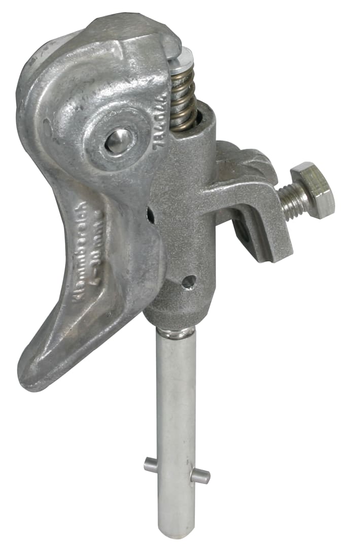 Pinza di fase a vite (con precarico a molla) con codolo lungo e innesto a baionetta come elemento di connessione lato fase secondo la norma EN/IEC 61230 (DIN VDE 0683-100) per linee aeree, adatta all'equipaggiamento di corde di messa a terra e di corto circuito. Antirotazione, esecuzione PK1.