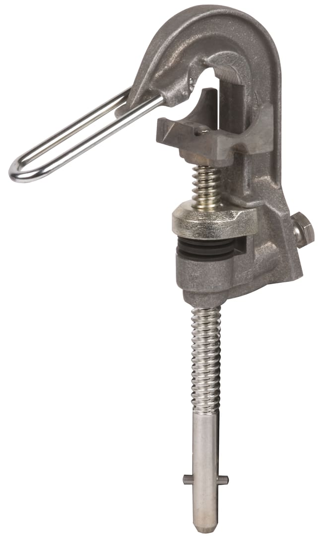 Pinza di fase a vite (con guida per l’aggancio) con codolo lungo e innesto a baionetta come elemento di connessione lato fase secondo la norma EN/IEC 61230 (DIN VDE 0683-100) per linee aeree, adatta all'equipaggiamento di corde di messa a terra e di corto circuito. Antirotazione, esecuzione PK1.