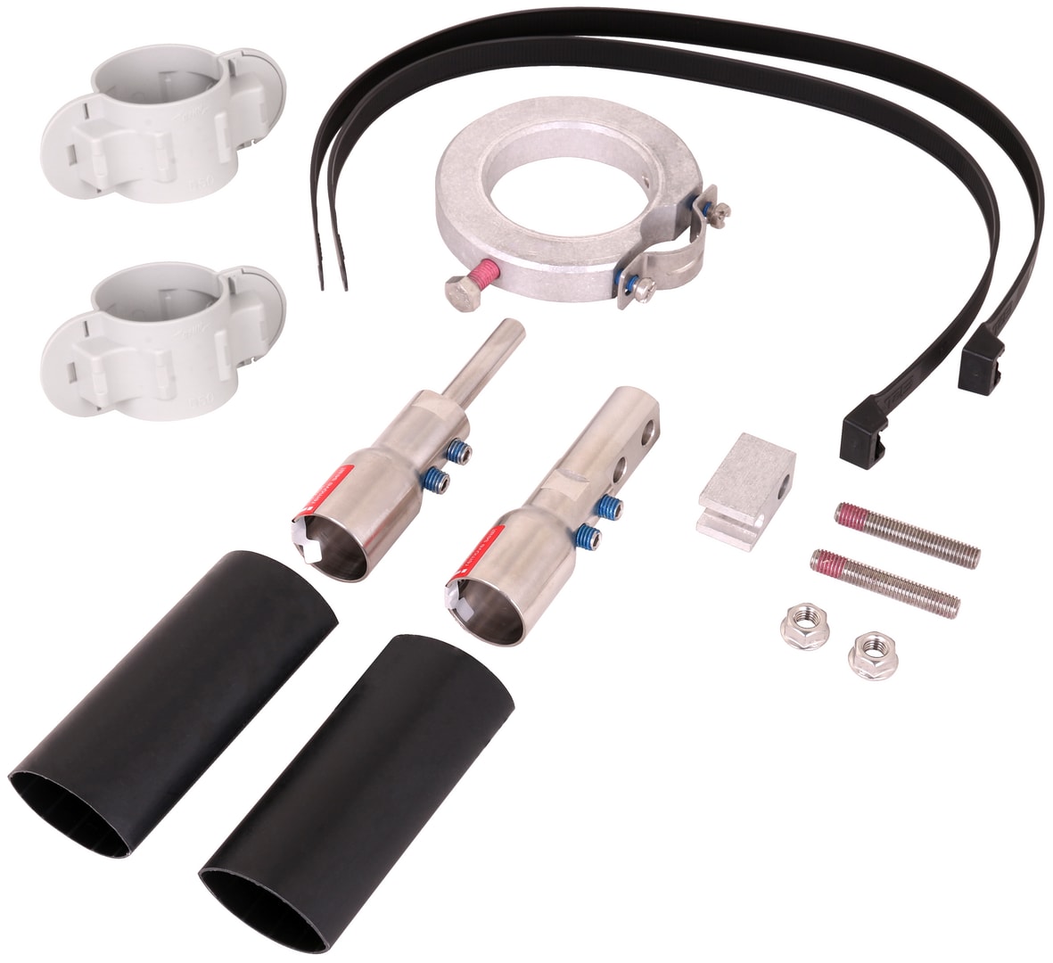 Set di connessione per conduttura HVI power per la posa nei tubi portanti HVI power in PRFV / Al costituito da elementi di connessione, barre filettate, elemento di connessione, tubo termorestringente, fascetta e anello di fissaggio con una staffa portafilo con fessura (?27 mm).