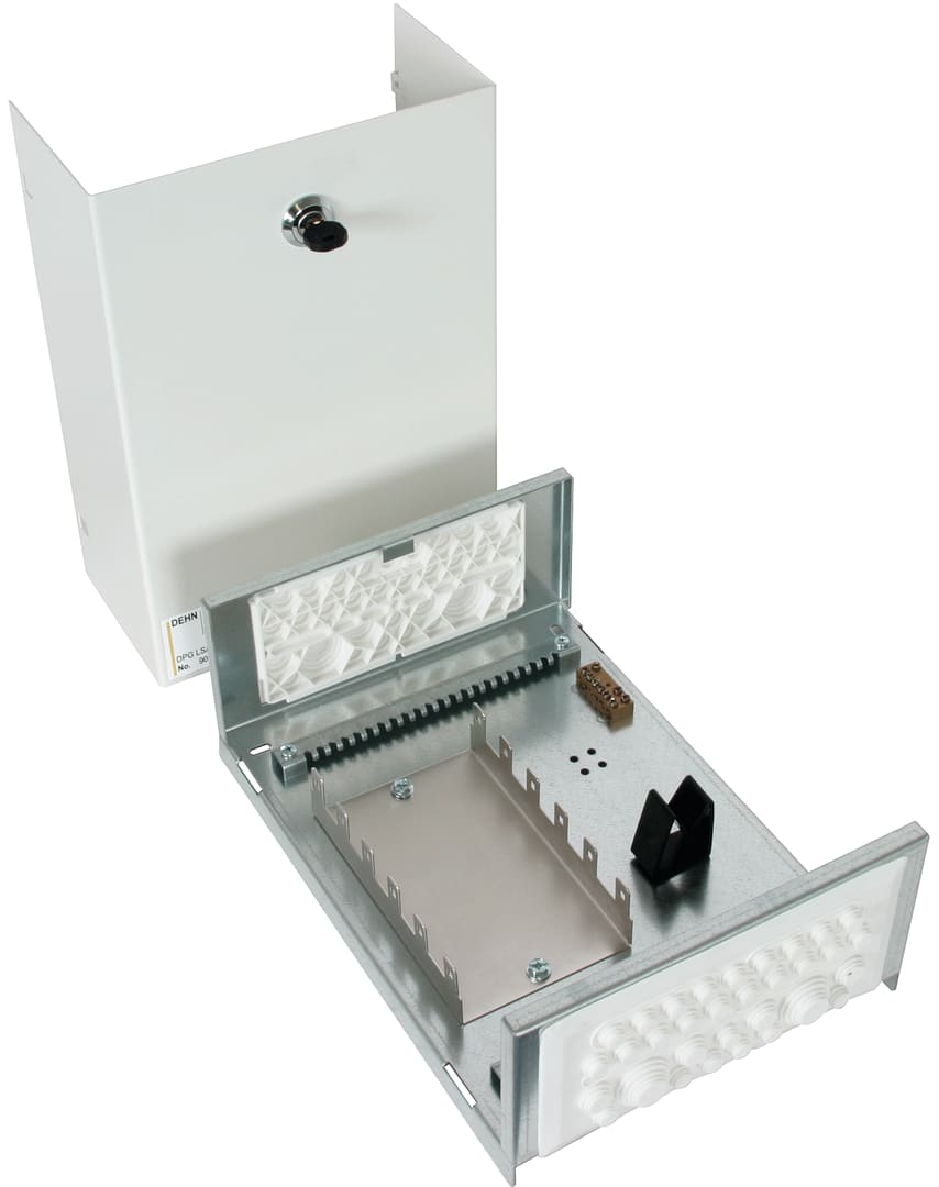 DPG LSA è un sistema di custodie prefabbricate con staffa di montaggio LSA e offre un’installazione ottimale di scaricatori e sistema di connessione per schermi (molla di contatto).