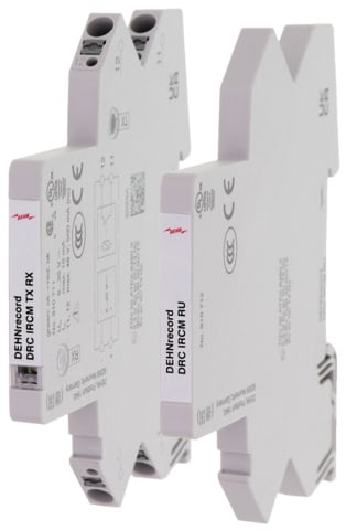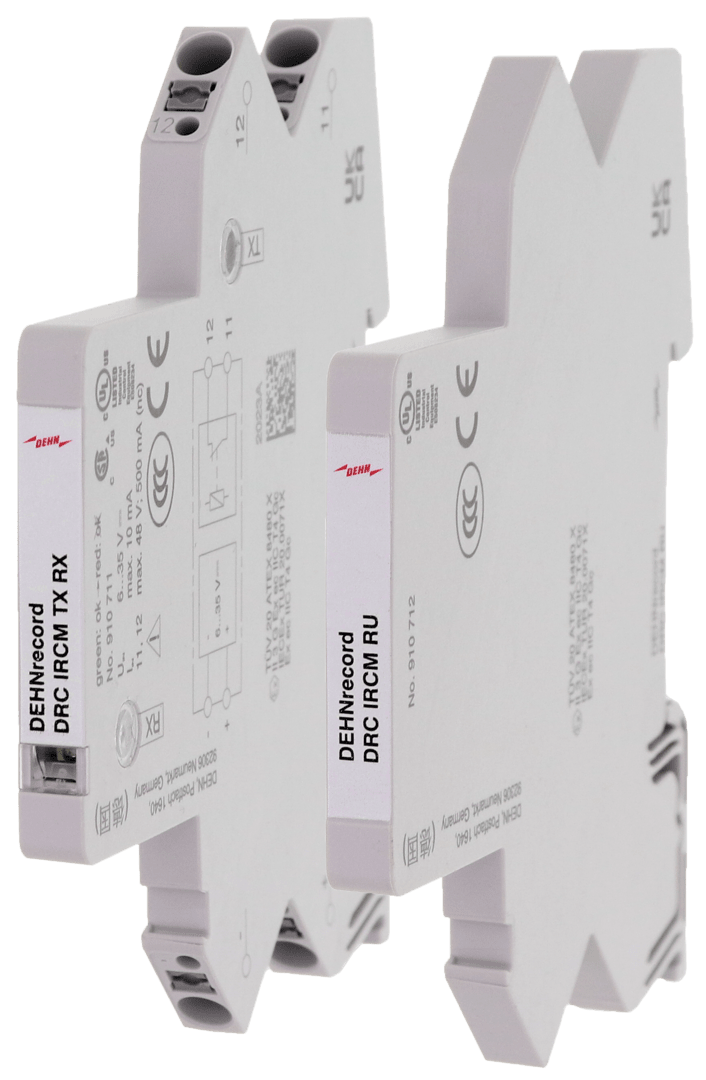 Unita di monitoraggio delle condizioni DEHNrecord, set dispositivo per guida DIN con trasmettitore/ricevitore ottico integrato e unita ottica di deviazione per il monitoraggio orientato alle condizioni degli scaricatori BLITZDUCTORconnect e DEHNpatch conLifeCheck Comunicazione ottica dello stato dello scaricatore tramite indicazione complessiva a LED combinata con segnalazione a distanza (contatto in apertura).