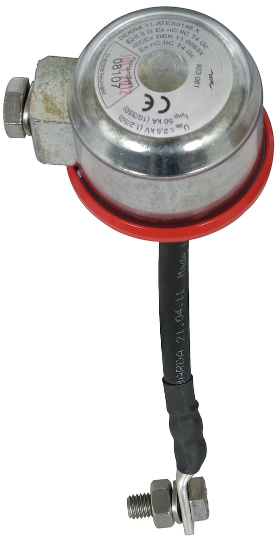 Spinterometro di sezionamento per ambienti Ex, per la connessione/ messa a terra indiretta in caso di fulminazione, di parti d’impianto normalmente isolati. Per l'applicazione sicura nella zona con pericolo d'esplosione 2 (gas). Spinterometro certificatoATEX per l’impiego nell’equipotenzializzazione antifulmine, secondo CEI EN 62305, in esecuzione approvata con collegamento flessibile per conduttori.