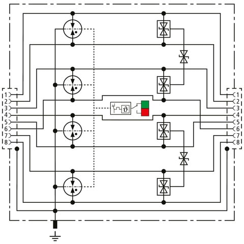 Scaricatore combinato universale salvaspazio con larghezza d?installazione di 19 mm e tecnologia di connessione RJ45 con indicatore di stato per una facile manutenzione. Protezione di applicazioni in cablaggi strutturati secondo la classe EA fino a 500 Mhz, ad es. pathcord per Ethernet, distributore di dati, sistemi di telecamere digitali a circuito chiuso, Power over Ethernet (IEEE 802.3 conforme fino a 4PPoE) e in generale interfacce basate su Ethernet. Protezione di tutti i doppini tramite potenti spinterometri a gas e diodi di protezione tra i conduttori di segnale e tra i doppini. Adattatore in versione completamente schermata con prese di collegamento RJ45 per il montaggio su montaggio su guida DIN. Con collegamento a vite aggiuntivo lato alloggiamento per un collegamento di terra ottimale.