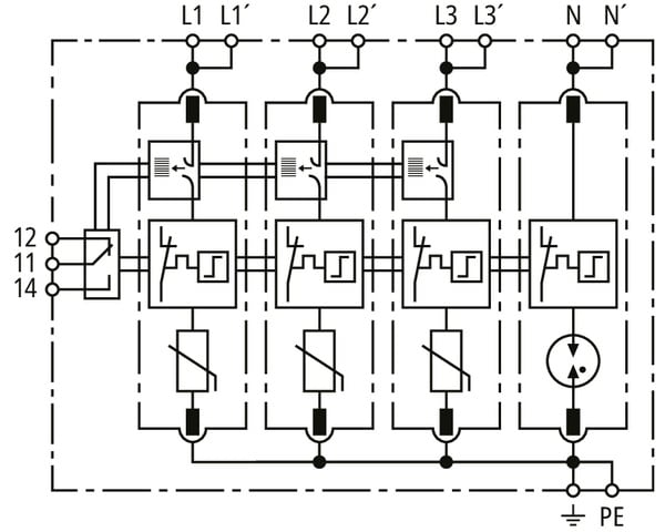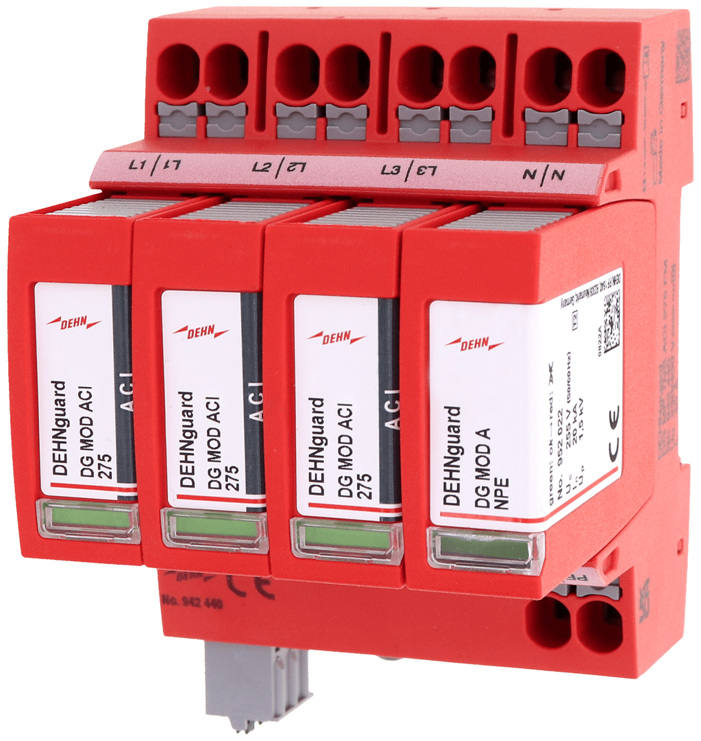 Limitatore di sovratensione multipolare DEHNguard MP ACI, tipo 2 secondo la norma EN 61643-11 con combinazione interruttore ACI / spinterometro, costituito da basetta con moduli di protezione a innesto e doppio morsetto di collegamento Push-in adatto a cablaggio in derivazione e passante a "V". Elevata sicurezza dell?apparecchio tramite l?unita di monitoraggio con Thermo-Dynamic-Control. Per proteggere da sovratensioni gli impianti elettrici utilizzatori in bassa tensione. Per l?impiego nel concetto di protezione da fulminazione a zone nelle interfacce 0B ? 1 e superiori.