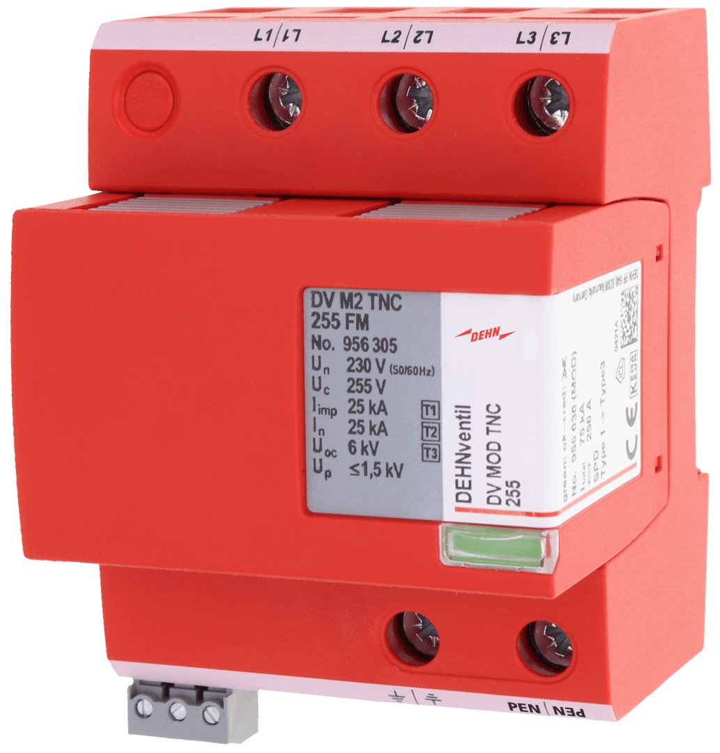 Scaricatore combinato multipolare DEHNventil modular, SPD Tipo 1 + Tipo 2 + Tipo 3 in accordo a EN 61643-11 (CEI EN 61643-11, CEI 37-8) su base spinterometrica, composto da elemento base e un modulo di protezione innestabile. Elevatissima continuita di servizio tramite spinterometri Rapid Arc Control (RAC). Permette la protezione di utenze finali. Per la protezione da sovratensioni di impianti elettrici utilizzatori in bassa tensione, anche in caso di fulminazione diretta. Per l'impiego nel concetto di protezione da fulminazione a zone, ai passaggi 0A - 2.