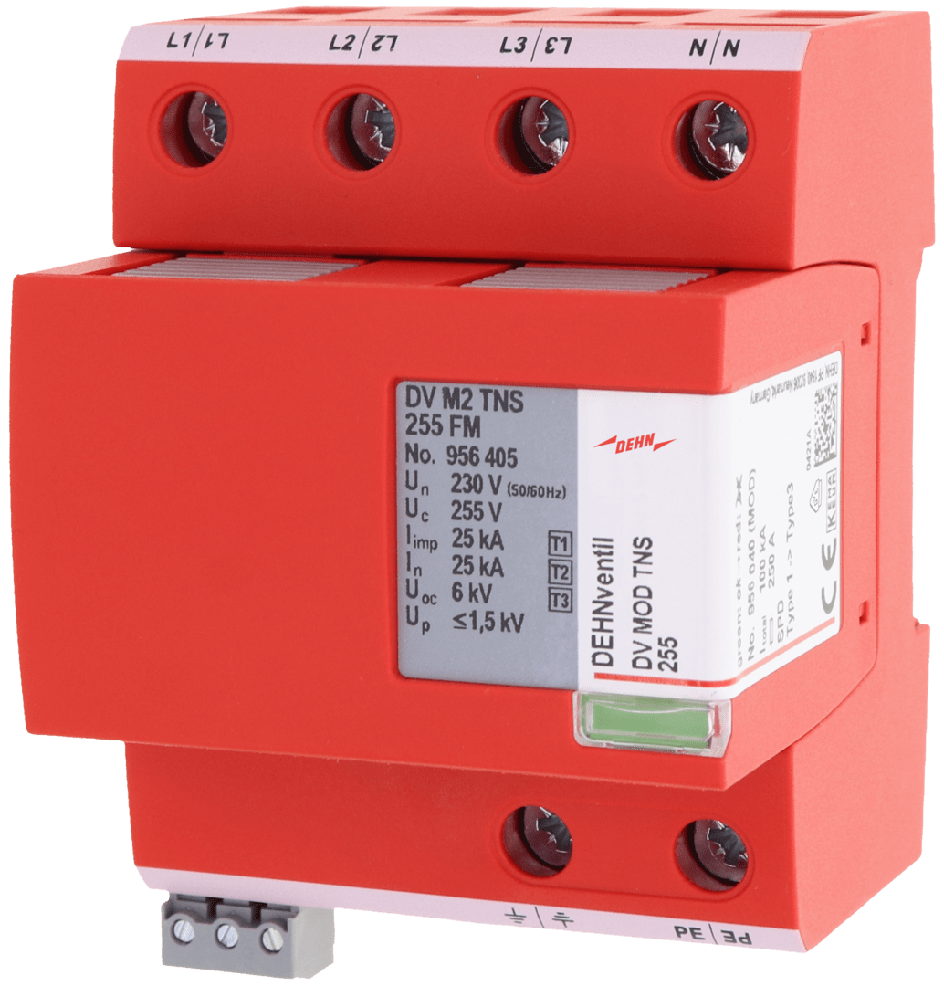 Scaricatore combinato multipolare DEHNventil modular, SPD Tipo 1 + Tipo 2 + Tipo 3 in accordo a EN 61643-11 (CEI EN 61643-11, CEI 37-8) su base spinterometrica, composto da elemento base e un modulo di protezione innestabile. Elevatissima continuita di servizio tramite spinterometri Rapid Arc Control (RAC). Permette la protezione di utenze finali. Per la protezione da sovratensioni di impianti elettrici utilizzatori in bassa tensione, anche in caso di fulminazione diretta. Per l'impiego nel concetto di protezione da fulminazione a zone, ai passaggi 0A - 2.