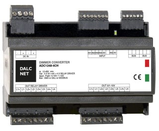 Serie ADC1248-4CH - Convertitore dimmer 4 canali analogici, 4 driver relè CH, ingresso 12-24-48Vcc, uscita 4x 0-10 / 1-10, 4x driver relè, 1x LED di stato canale, comando DALI, ingresso 4x Master 1x, N.A. Pulsanti / 0-10 / 1-10 / Potenziometro.