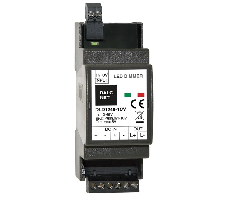 Centralina LED Dalcnet a canale singolo e funzione pulsante pensata per pilotare carichi in tensione costante come moduli e strisce led in bassa tensione. Caratteristiche tecniche dimmer LED DLD1248-1CV: • Comando impostabile: pulsante (push N.O.) / 0÷10V / 1÷10V / Potenziometro • Tensione in ingresso: da 12V a 48V - Uscite in tensione per carichi R-L-C • Controllo di precisione della corrente con sensore non dissipativo • Frequenza D-PWM impostabile da selettore : 300 / 600 / 1200 HZ - Modulazione PWM •Curva di regolazione impostabile: Lineare / Quadratica / Esponenziale • Regolazione della luminosità fino allo spegnimento completo (Dim to Dark) • Range di temperatura di esercizio da -40° a +60°C. • Garanzia 5 anni