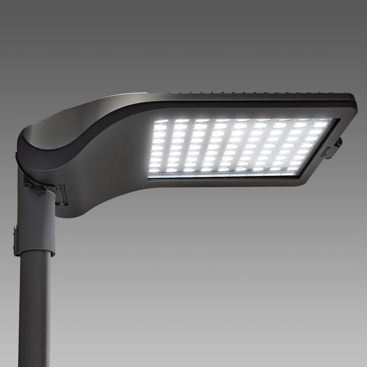 Corpo e telaio: In alluminio pressofuso e disegnati con una sezione e bassissima superficie di esposizione al vento. Alette di raffreddamento integrate nella copertura. Attacco palo: In alluminio pressofuso è provvisto di ganasce per il bloccaggio dell’armatura secondo diverse inclinazioni. Orientabile da 0° a 15° per applicazione a frusta; e da 0° a 10° per applicazione a testa palo. Passo di inclinazione 5° Idoneo per pali di diametro 63-60mm. Diffusore: vetro trasparente sp. 4mm temperato resistente agli shock termici e agli urti (UNI-EN 12150-1 : 2001). Verniciatura: A polvere con resina a base poliestere, resistente alla corrosione e alle nebbie saline. Dotazione: Dispositivo automatico di controllo della temperatura. Nel caso di innalzamento imprevisto della temperatura del LED causata da particolari condizioni ambientali o ad un anomalo funzionamento del LED, il sistema abbassa il flusso luminoso per ridurre la temperatura di esercizio garantendo sempre il corretto funzionamento. Diodo di protezione contro i picchi di tensione. Equipaggiamento: Completo di connettore stagno IP67 per il collegamento alla linea. Sezionatore di serie in doppio isolamento che interrompe l’alimentazione elettrica all’apertura della copertura. A richiesta: E’ possibileinstallare, a bordo dell’apparecchio, un sistema di controllo per la rete gestione con linea dimming 1-10V per la ricezione e trasmissione dati. Dissipatore: Il sistema di dissipazione del calore è appositamente studiato e realizzato per permettere il funzionamento dei LED con temperature inferiori ai 50° (Ta = 25°) garantendo ottime prestazioni/ rendimento ed un’ elevata durata di vita. Ottiche modulari a 9 LED: In policarbonato V0 metalizzato ad alto rendimento con micro sfacettatura satinata. Ottica asingolo LED per un miglior controllo della luce. Equipaggiato con moduli Led 2.1w cad. - 8280/12420/14490/18630lm - 4000K - 700mA. Il rendimento totale dell’apparecchio è prossimo al 100%. A richiesta: possibilità di diversi tipi di fasci per aree differenti - bipotenza con sottocodice -30. NORMATIVA: Prodotti in conformità alle norme EN60598 - CEI 34 - 21. Hanno grado di protezione secondo le norme EN60529.