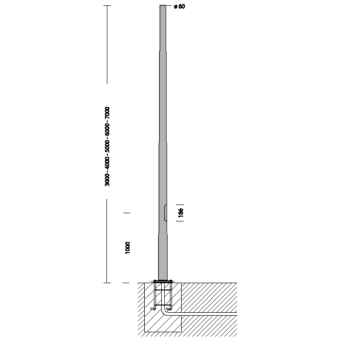 Pali in acciaio laminato a caldo e privo di saldature. Predisposto con foro per ingresso cavo di alimentazione, con attacco testa palo ø60. Per la versione con base è necessario acquistare 4 tirafondi da interrare, bulloneria e tappi. Dimensioni finestradi ispezione 38x132 (h 3 000) - 45x186 (h 4000-5000-6000), completo di un portafusibile di protezione, 2 fusibili da 16A, morsettiera asportabile 4 poli/3 vie = 10mmq e derivazione 2,5mmq. Di serie in classe di isolamento II. Attenzione quando si utilizzano apparecchi in classe di isolamento I prevede le connessioni per la messa a terra. N.B.: La possibilità di accoppiare una composizione al palo è subordinata alla verifica della resistenza alla spinta del vento, nelle zone del territorio previste dalla norma D.M.14/01/2008. Secondo le ipotesi di carico previste dalle norme EN 40-3-1.