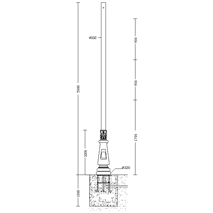 Palo in acciaio zincato a caldo e verniciato in polvere di poliestirene termoindurente. Base, finestra di ispezione e decori stampati in alluminio pressofuso e successivamente verniciati. Con finestra di ispezione, completa di 2 portafusibili di protezione, 2 fusibili da 16A, morsiettiera asportabile. Viteria in acciaio inox.