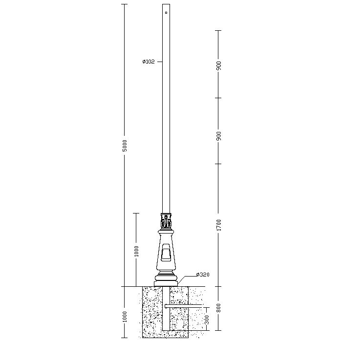Palo in acciaio zincato a caldo e verniciato in polvere di poliestirene termoindurente. Base, finestra di ispezione e decori stampati in alluminio pressofuso e successivamente verniciati. Con finestra di ispezione, completa di 2 portafusibili di protezione, 2 fusibili da 16A, morsiettiera asportabile. Viteria in acciaio inox.