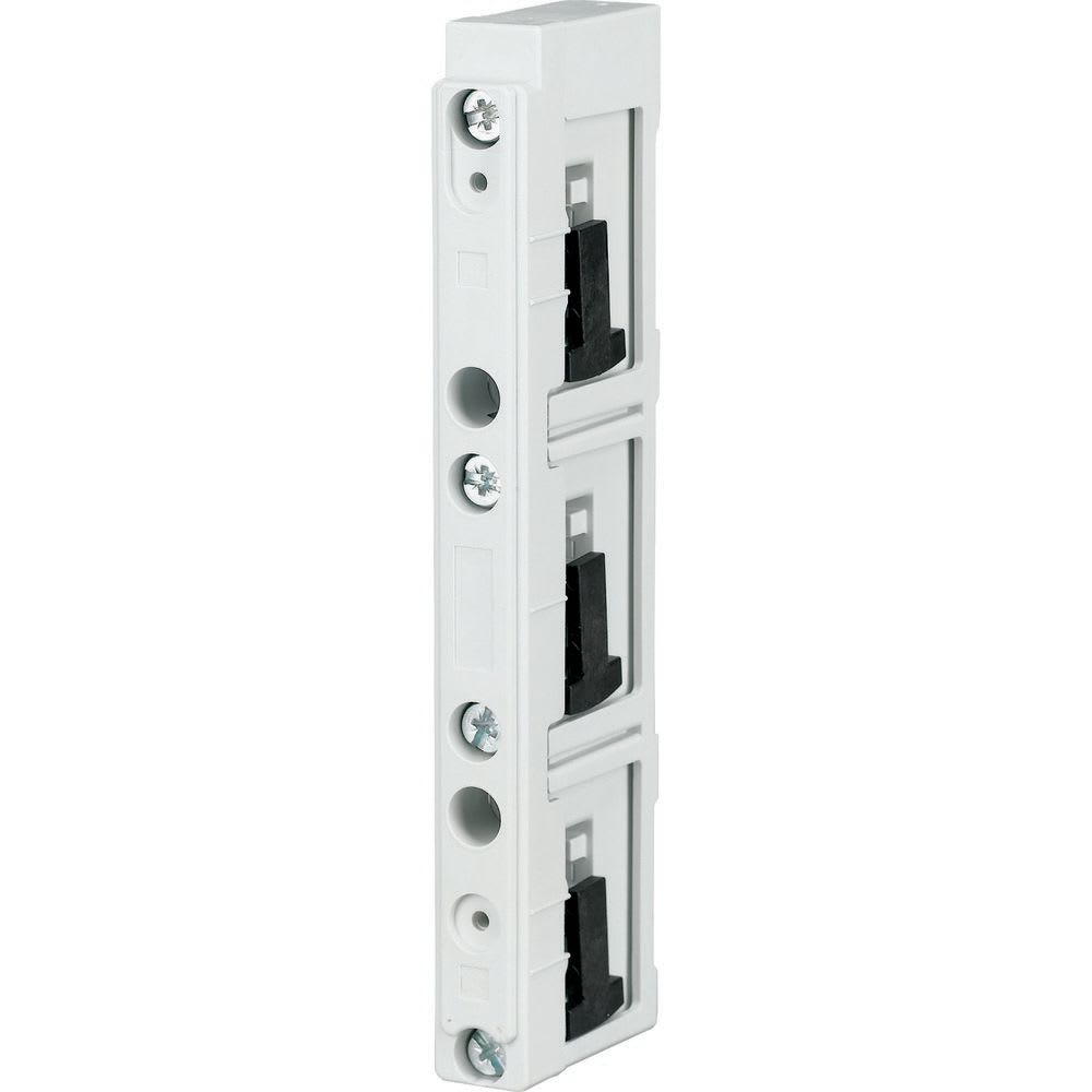 Supporto per sbarra collettrice IEC, sistema 60-mm, corrente nominale di esercizio Ie=630A, poli= 3, utilizzabile per 12x5/10, 20x5/10 e 30x5/10, con cursore per adattarsi alle rispettive dimensioni delle sbarre, con blocco vite all'interno, resistente atemperature fino a 120 °C, resistenza del binario CTI 200, autoestinguente secondo UL 94, RAL 7035, termoplastico, senza silicone, senza cloro, privo di alogeni, distanza tra i supporti per sistema a sbarre corrispondenti al diagramma di resistenza al cortocircuito, omologata UL