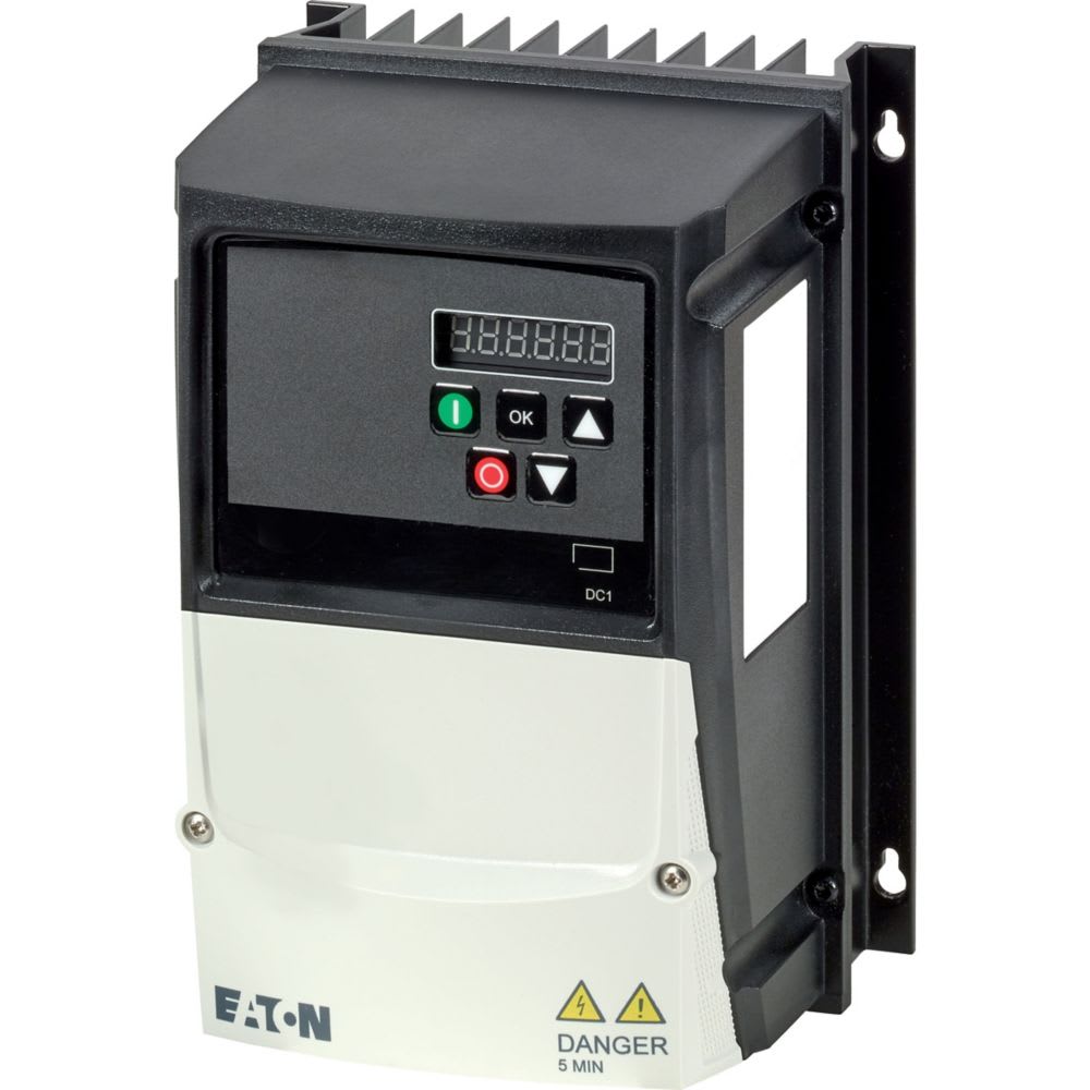 Convertitore di frequenza, Rilevatore tipo: DC1, Tensione nominale d'impiego: Ue = 230 V AC, monofase, 240 V AC, monofase, Tensione di uscita a Ue: U2 = 230 V AC, trifase, 240 V AC, trifase, Tensione di rete (50/60Hz): ULN = 200 (-10%) - 240 (+10%) V, Corrente nominale d'impiego per 150 % sovraccarico: Ie = 4.3 A, Nota: Corrente nominale d'impiego con una frequenza di commutazione di 6 kHz ed una temperatura ambiente di +40 ℃, Nota: Ciclo di sovraccarico per 60 s ogni 600 s, Potenza motore assegnata Nota: per normali motori asincroni in corrente trifase a quattro poli a ventilazione interna ed esterna con 1500 min-1 a 50 Hz o 1800 min-1 a 60 Hz, Ciclo di sovraccarico per 60 s ogni 600 s, a 230 V, 50 Hz, Potenza motore assegnata 150 % sovraccarico: P = 0.75 kW, 150 % sovraccarico: IM = 3.2 A, Potenza motore assegnata Nota: a 220 - 240 V, 60 Hz, Potenza motore assegnata 150 % sovraccarico: P = 1 HP, Potenza motore assegnata 150 % sovraccarico: IM = 4.2 A, Grado di protezione: IP66/NEMA 4X, Interfacce/bus di campo (incorporate): OP-Bus (RS485)/Modbus RTU, CANopen®, Collegamento bus di campo (opzionale): SmartWire-DT, Equipaggiamento: Filtro soppressore radiodisturbi, Display a 7 segmenti, Protezione scheda elettronica aggiuntiva, Resistente ai raggi UV, Grandezza: FS1, Conformità alle norme: Requisiti generali: IEC/EN 61800-2, Requisiti EMV: IEC/EN 61800-3, Requisiti di sicurezza: IEC/EN 61800-5-1