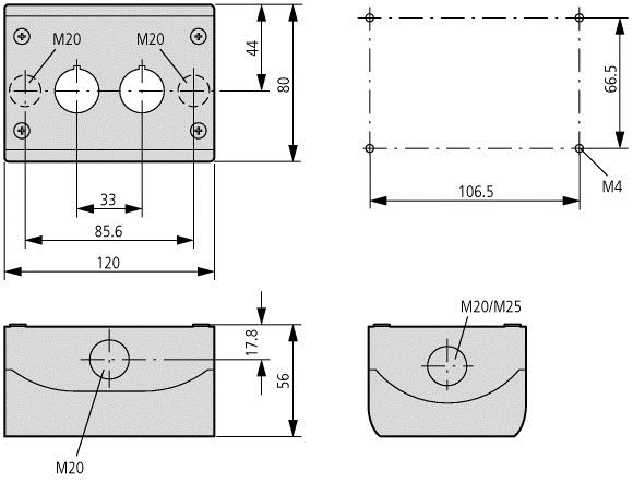 Custodia per il montaggio sporgente, Costruzione: materiale isolante, Con viti in acciaio di alta qualità, Numero di posizioni: 2, Ingresso cavo: posteriore: 2 x M20, nella parte superiore: 1 x M20, laterale: 2 x M20/M25 (1 x ciascun lato), Grado di protezione: IP66, IP67, IP69K, Valore colore RAL: RAL 7035, Colore: Base della custodia antracite, Collegamento con SmartWire-DT: no, Utilizzo con: Pulsanti (luminosi), Selettori (luminosi), Selettori a chiave, Indicatore luminoso, Pulsanti arresto controllato/arresto d&'92;emergenza con etichetta gialla