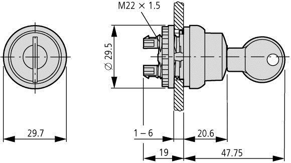 Selettore a chiave, Gamma di prodotti: RMQ-Titan, Apparecchio singolo, Progettazione: Sblocco a chiave, ad impulso, Non adatto per sistemi gerarchici di chiavi, 3 posizioni, Grado di protezione: IP66, Ghiera frontale Titan, Collegamento a SmartWire-DT: sì, con collegamenti SWD-RMQ, Dimensioni frontali: 29,7, Istruzioni: Funzionalità permanente/impulsivo, modificabile con M22-XC-Y, Estrazione chiave convertibile con adattatori di codifica M22-XC-..., con ponticello per azionamento del contatto centrale, Con 1 chiave, Conformità alle norme: IEC/EN 60947, VDE 0660, Grado di protezione: IP66