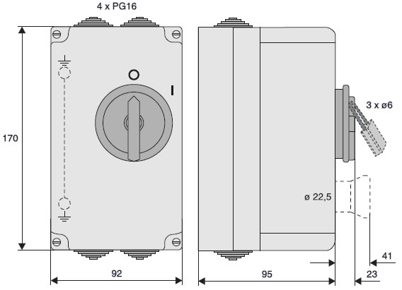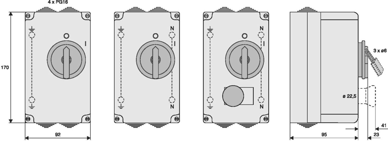 Custodia per ambienti umidi per interruttore di manovra, funzione: ON/OFF, dissipazione calore dei dispositivi installati max. 17 CO, grado di protezione IP54, classe di isolamento II, larghezza di montaggio massima 4SU (70 mm), capacità del morsetto N/PE max. 16 mm², tipo conforme alla norma EN 50298