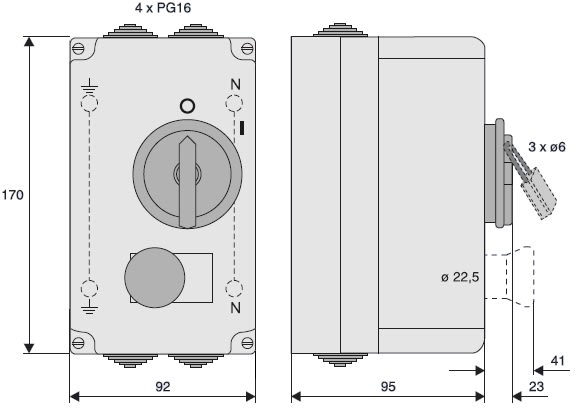 Custodia per ambienti umidi per interruttore di manovra, funzione: ON/OFF con spegnimento di emergenza, dissipazione calore dei dispositivi installati max. 17 CO, grado di protezione IP54, classe di isolamento II, larghezza di montaggio massima 4SU (70 mm), capacità del morsetto N/PE max. 16 mm², tipo conforme alla norma EN 50298