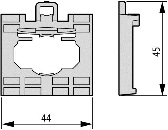 Morsetto di montaggio con quattro punti di installazione per contatti ed elementi LED della gamma di prodotti M22 RMQ. Il normale adattatore M22-A ha solo tre punti. È necessario Il quarto adattatore, per esempio, per 4 pulsanti attuatore e 4 joystick, inoltre, per i casi in cui è necessario collegare quattro contatti in serie.