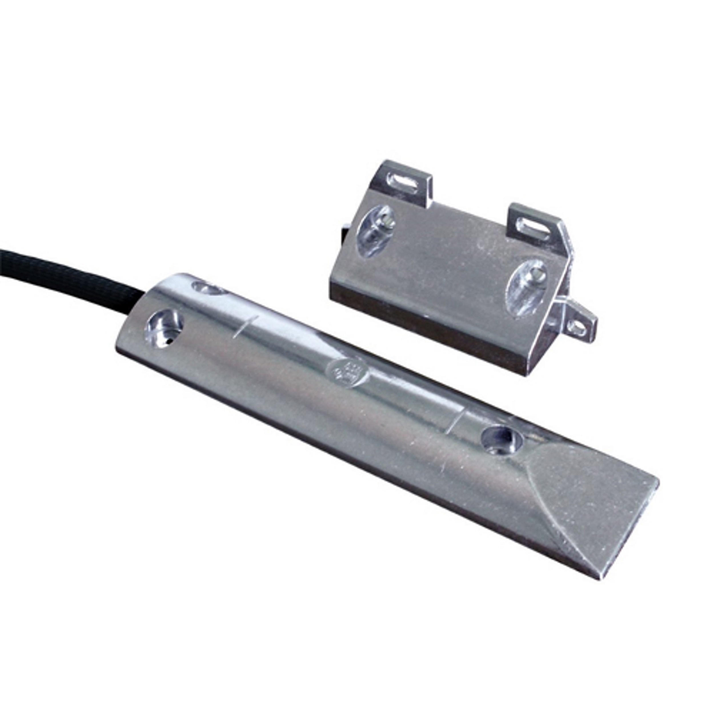 Contatto magnetico per porte basculanti. Fissaggio a pavimento. In alluminio pressofuso. Con loop filo antimanomissione (tamper). Con guaina protezione cavo.