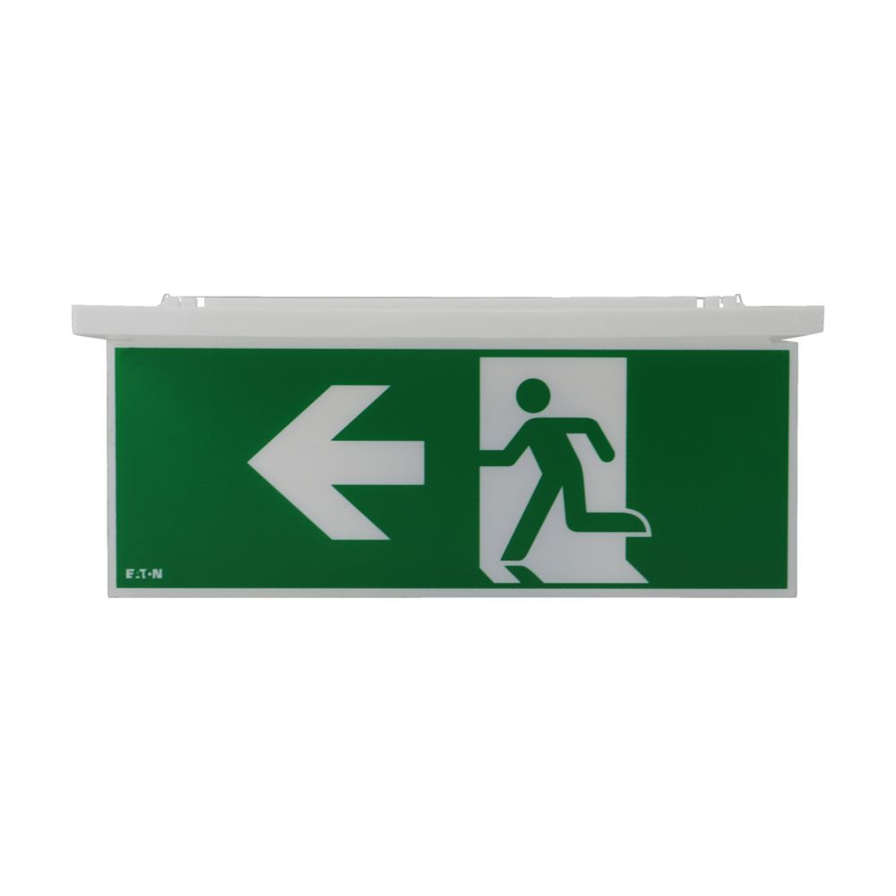 Pannello di segnalazione bifacciale opale doppia funzione ad alta uniformità Eaton da abbinare ad apparecchi NexiTech, modello NEXI-PLEXO-20-LR, per indicazione sinistra-destra, distanza di visibilità 20m, grado di protezione IP40.