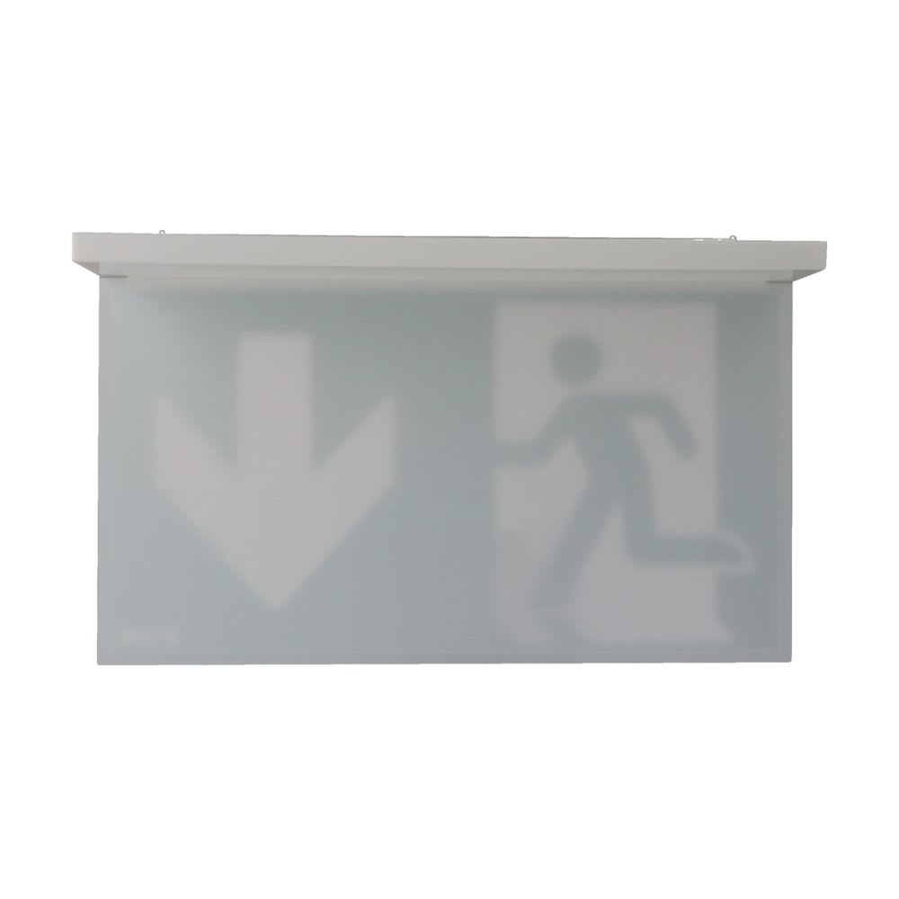 Pannello di segnalazione bifacciale opale doppia funzione ad alta uniformità Eaton da abbinare ad apparecchi NexiTech, modello NEXI-PLEXO-DB, per indicazione basso-cieco, distanza di visibilità 30m, grado di protezione IP40.