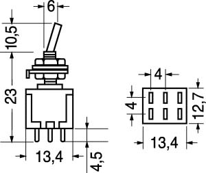 DEVIATORE MINIATURA 2 SCAMBI STANDARD. PORTATA:6 A - 125 V. CORPO:materiale fenolico. LEVA:ottone nichelato. TERMINALI:c.s. DADO RICAMB.:4/15210. CAPPUCCI:4/6560 - 4/6708.