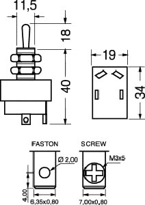 Interruttore bipolare a levetta, corpo in resina fenolica, leva in ottone nichelato, contatti in argento, terminali faston 6,35