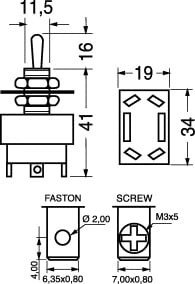DEVIAT. BIP. A LEVA / PIASTRA. PORTATA:10 A - 250 V o 15 A - 125 V. CORPO:resina termoindur. CONTATTI:argento. TERMIN.:a vite - faston 6,35. PER FASTON:4/11520. COPRI FASTON:4/11530. CAPPUCCIO:4/6710.