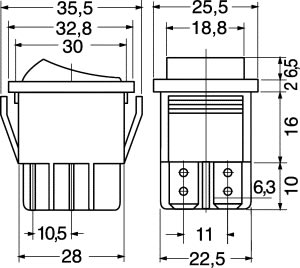 Interruttore bipolare luminoso • Tensione: 220 V • Portata: 15 A • Corpo in abs nero • Contatti in ottone • Fissaggio al pannello: autobloccante • Terminale: faston passo 6,35