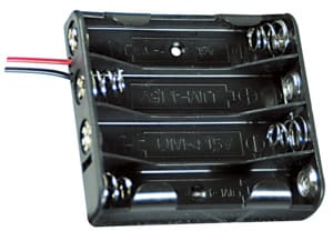 PORTAPILE PER 4 PILE MINISTILO (AAA-UM4). CORPO:polipropilene. CONNESSIONE:fili liberi. LUNG. FILI:150 mm. PER BATTER.NI-MH:30/284. PILE ALCALINE:30/24000 - 30/25000.
