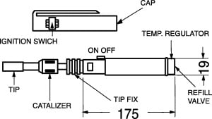 SALDATORE PROFESSIONALE RICARICABILE A GAS CON DOPPIA AUTONOMIA TASCABILE. CORPO:pvc. TEMP. MAX:440° C. POT. EROGATA:10 ÷ 60 W. AUTONOMIA:2 ore circa. Utilizzando gas liquido in bomboletta si ricarica come un comune accendino. ADATTO CON PUNTE:ARIA CALDA:7/580. FIAMMA LIBERA:7/581. SALDATURA:7/582. RICARICA:7/312