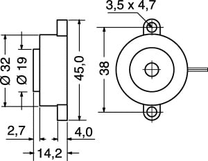 BUZZER PIEZOCERAMICO CON CIRCUITO OSCILLATORE. MONTAGGIO:a telaio. INTENSITÁ SUONO:90 dB. ASSORBIMENTO:15 mA. ALIMENTAZ.:3 ÷ 24 V. FREQ. RIS.:3.9 kHz ± 0.5. TEMP. LAV.:-20°C÷+70°C. LUNG.FILI:190 mm. Adatti per radiosveglie, antifurti, interfonici, ecc.